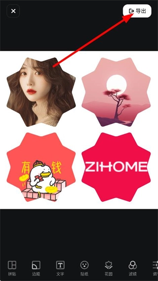 3、在拼贴编辑页面,编辑完成后,点击右上角的导出,导出拼贴作品。