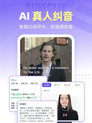 1、首创真人实景拆解音节:国内首创"真人外教实景拆解音节"的学习模式。借助真人出镜的口型、表情与肢体动作,使单词记忆更为立体直观,有助于掌握地道发音。