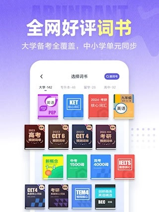 3、海量分类词库:词库内容覆盖从小学至专业的各类考试与教材,包括四六级、考研、托福雅思、商务英语等。词书数量庞大,据称能满足全年龄段学习者的不同需求。