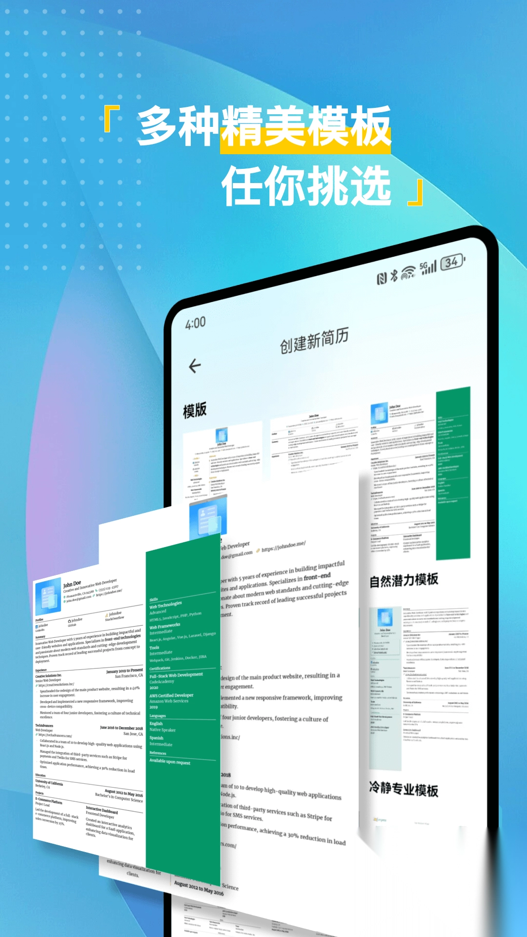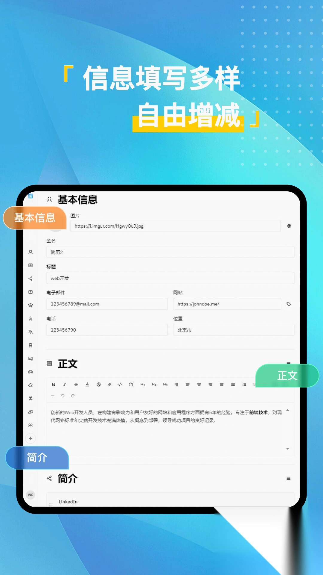 2、强大的内容编辑功能随即发挥作用,用户能够在各个预设板块里,自由填写个人信息、教育背景、工作经历以及技能特长等内容。