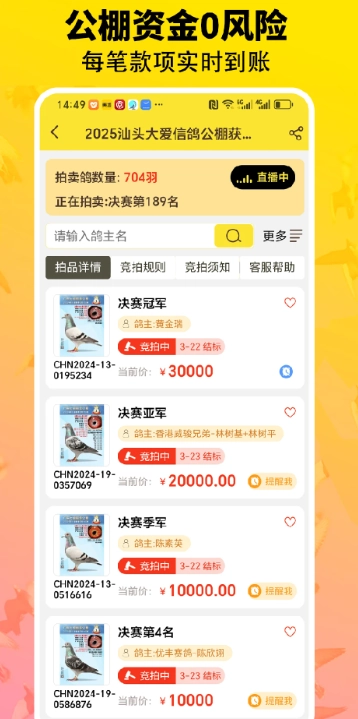 1、软件后打开你就可以在线进行赛鸽的实时行业交易。