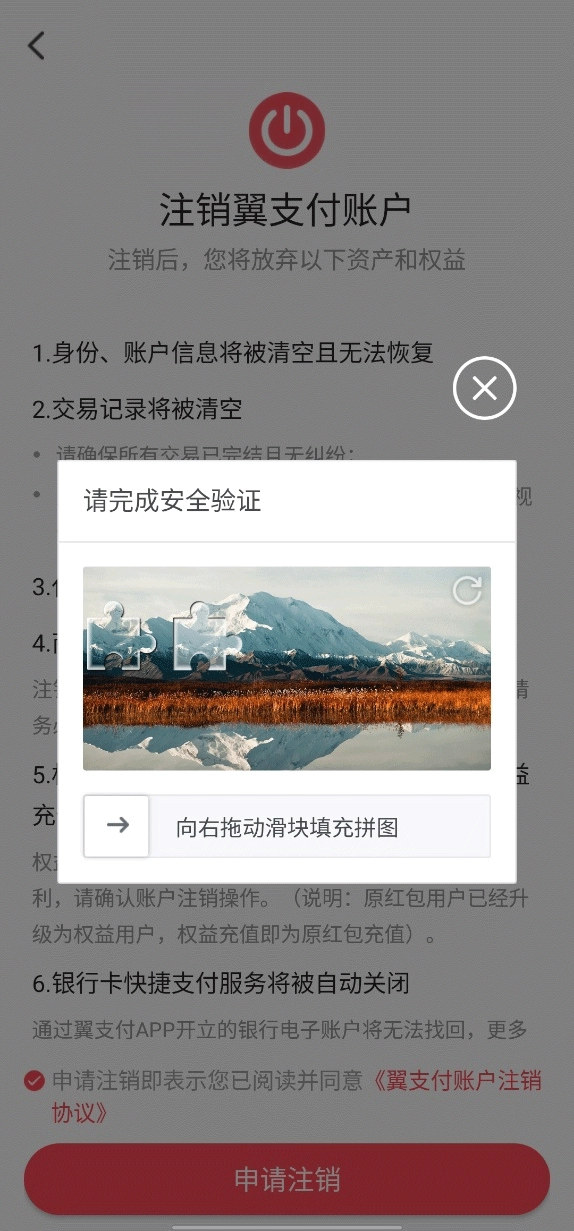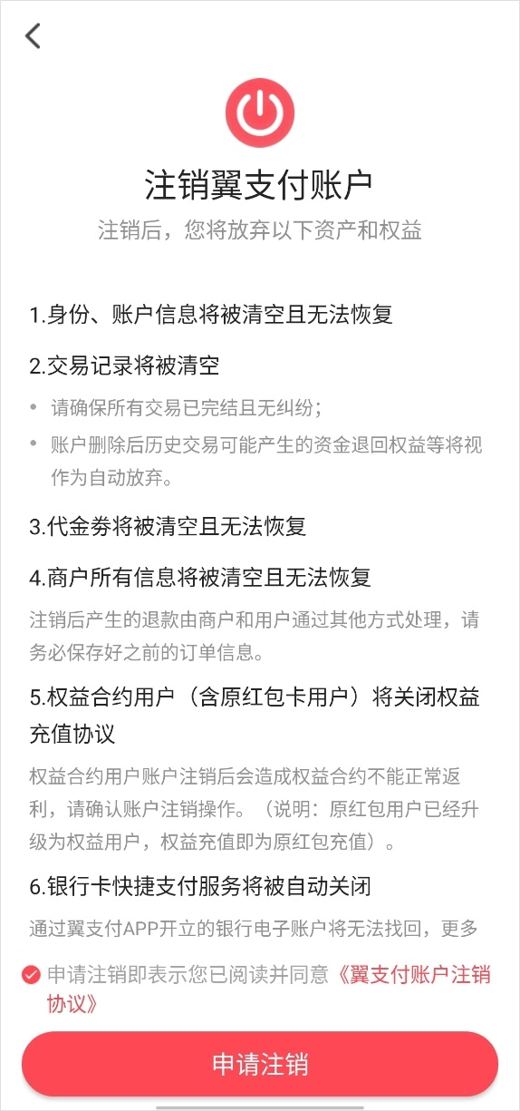 5、勾选“申请注销即表示您已阅读并同意《翼支付账户注销协议》”,点击“申请注销”