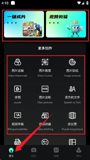 3、来到软件首页,具体页面如所展示的图。在此处,有诸多剪辑创作工具可供使用,像一键成片、视频剪辑、图片滤镜以及视频字幕等等。