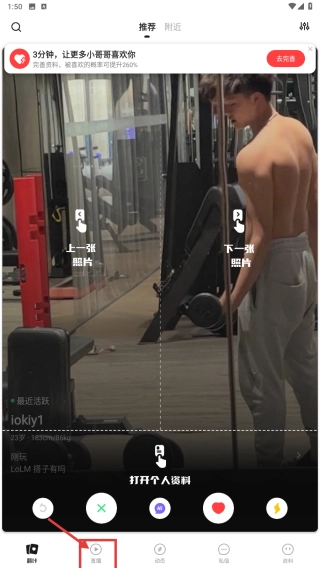 1、打开社交类,点击底部直播选项,进入直播内容页面。