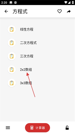 2、在方程式页面,点击2x2数组,进入2x2数组计算页面。