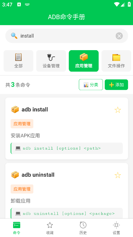 2、例如查找“安装APK”命令,点击进入“应用管理”分类,找到“adb install”条目并点击查看详情。