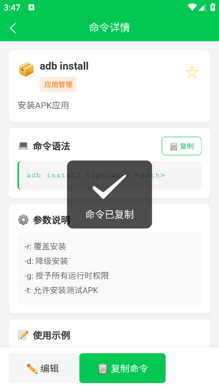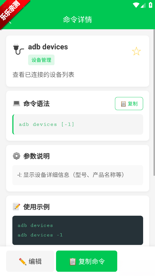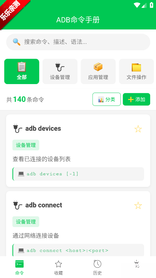 ADB命令手册是一款面向Android开发者、测试人员以及技术爱好者打造的工具类应用。它致力于为用户提供全面且便捷的ADB命令查询及使用指引,收纳了数百条ADB命令,所涉场景包括设备连接、应用管理、文件传输、日志抓取、模拟操作(像点击、滑动等)、性能监控等。该应用还具备终端模拟器功能,用户能够直接在App内输入ADB命令,随即查看实时反馈,无需切换到电脑端操作。它支持多设备连接管理,可针对指定的目标设备执行命令,还支持实时抓取设备日志(adb logcat),并能依据时间、标签、优先级对关键信息进行过滤。值得一提的是,所有命令库和案例都支持离线访问,即便没有网络连接,用户也可随时查询。