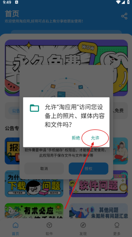 1、安装淘应用软件,然后允许相关权限进行访问。