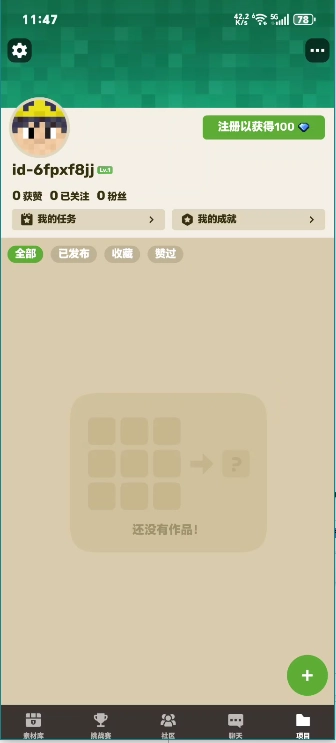 在“项目”板块,可查看自己的任务、成就,还能管理已发布、收藏、赞过的作品,也可注册获取钻石奖励,开始创作并发布自己的作品。