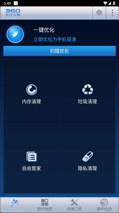 360优化大师具备系统优化清理、系统增强管理、软件管理、硬件测评、硬件信息查看等全面且有效的基础功能模块,还配备多个实用小工具。其操作简单、高效且安全。