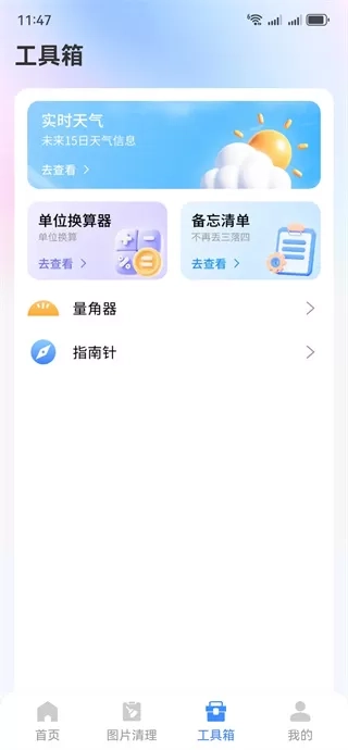 4、配备工具箱,其中涵盖天气查询、单位换算、备忘清单等各类实用小工具。