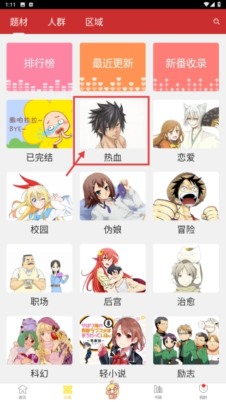 2、在分类页面,点击热血题材,浏览热血漫画列表。