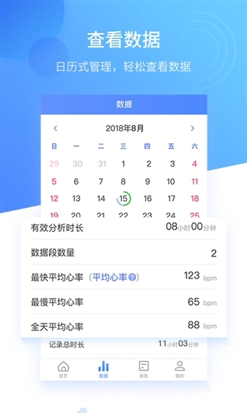 3、通过日历式管理记录的心电数据,可随意选择日期来查看历史数据信息。