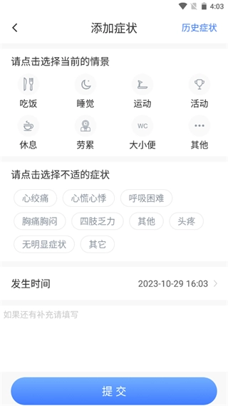 2、实时记录症状,方便医生进行诊断,按照提供的模板选择相关症状信息;
