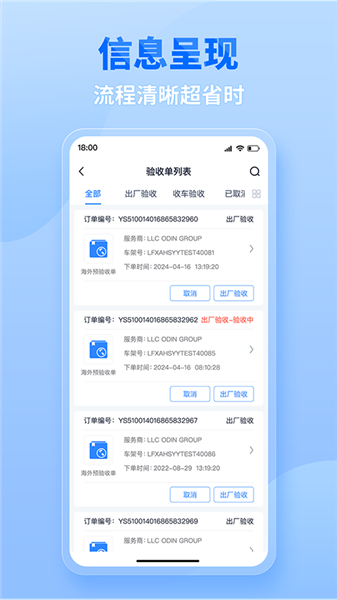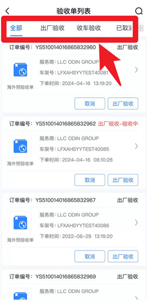 3、验收单列表可查看出厂、收车以及取消的所有单据,便于及时核对运输状况。