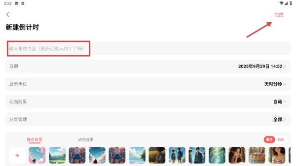 3、在新建倒计时页面,输入事件内容,点击右上角完成按钮。