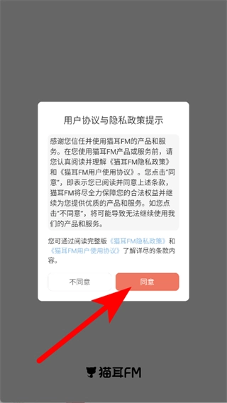 1. 开启后,于用户协议与隐私政策提示页面点击同意。