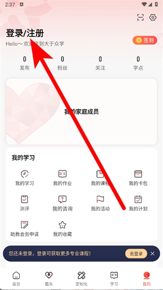 2、在我的页面,点击登录注册。