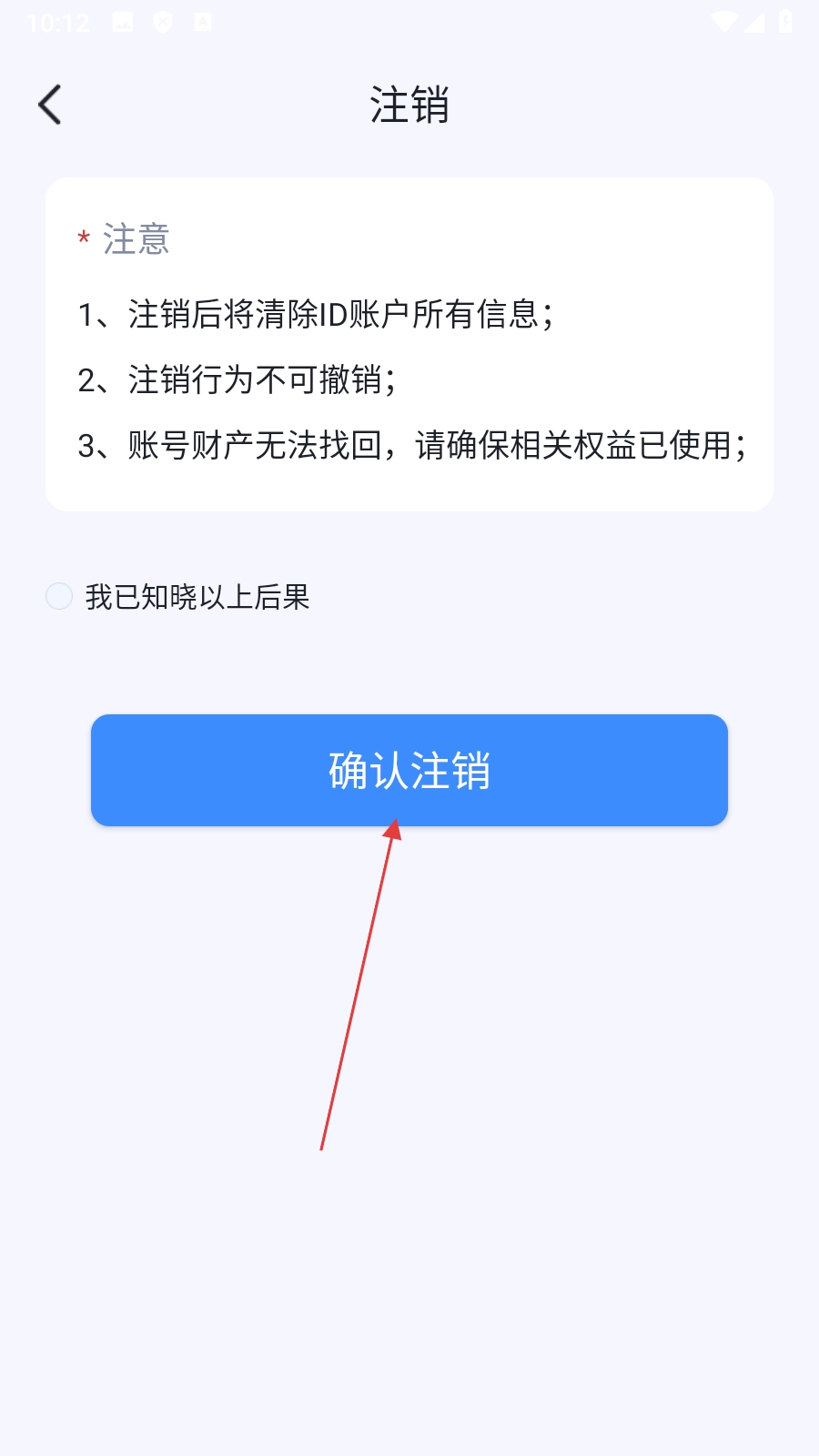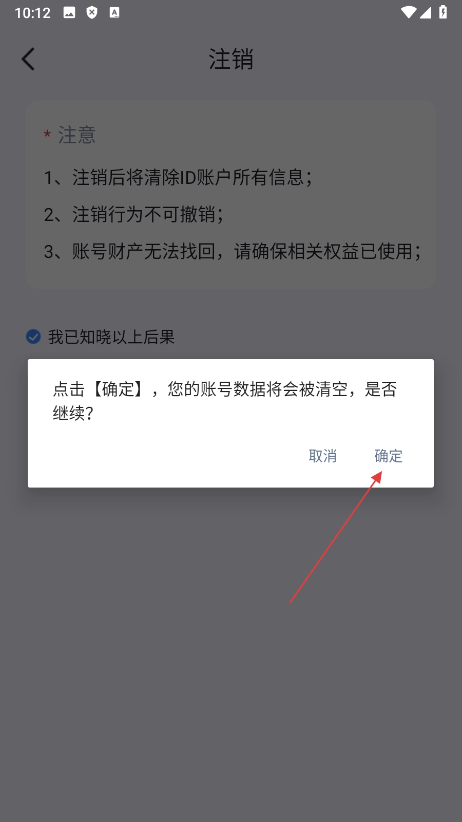3、在注销确认页面,勾选【我已知晓以上后果】后点击【确认注销】,弹出注销提示框。