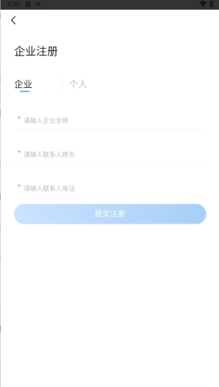 3、在软件的注册页面,企业注册输入企业名称、联系人、电话即可完成注册。