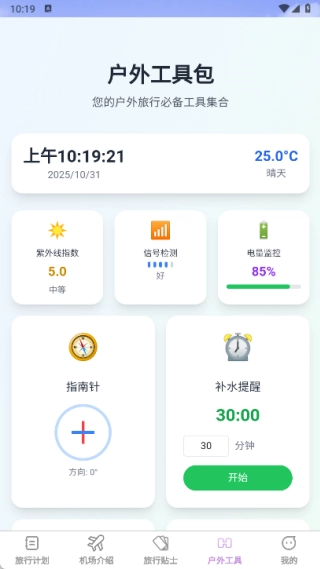 4、在户外工具页面可以知晓户外的最新信息,还有指南针、补水提醒等功能。