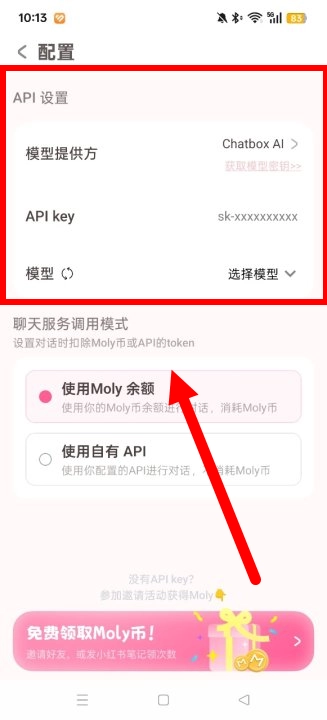 3、增添 API 模型提供方、API Key 激活密钥以及模型等内容,同时添加聊天服务的调用模式。调用模式主要包含两种:使用 Moly 余额与使用自由 API。使用 Moly 余额这种方式需要支付费用,而使用自由 API 属于免费接口,但需通过其他用户分享来获取。