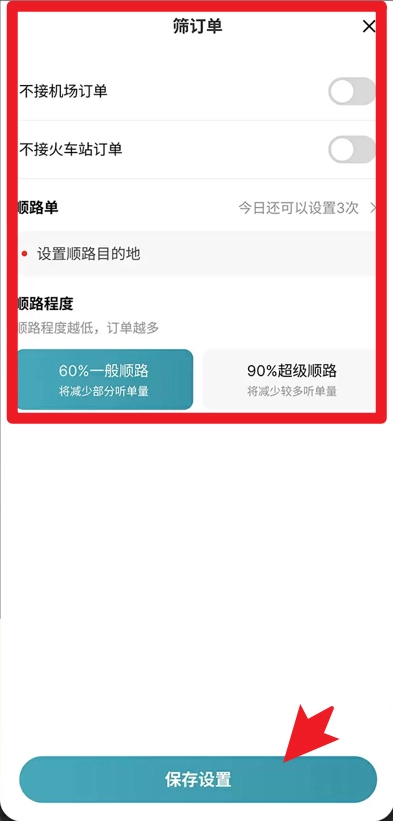 5、通过筛订单功能可设置是否接机场单、火车站单,并可设置顺路单的程度,最后点击保存设置即可。