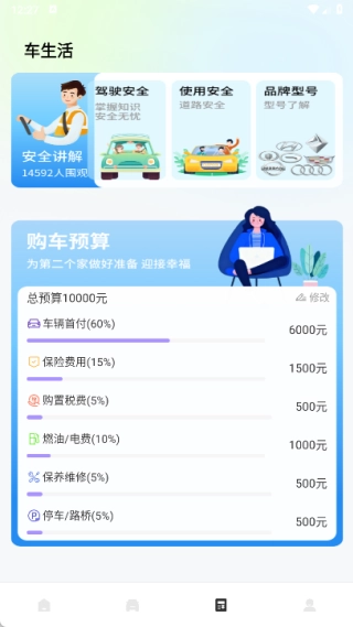 4、在车生活页面中可以了解安全讲解,还可以进行购车预算的计算。