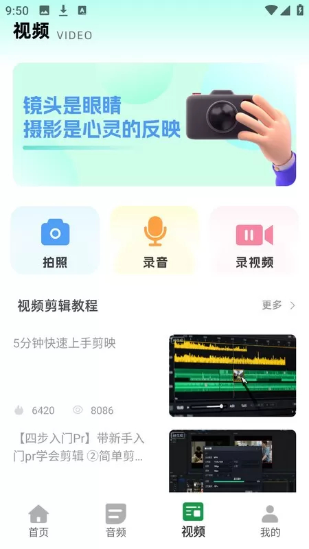 4、视频页面不仅支持拍照、录音、录视频,还提供实用的剪辑教程,助你快速上手。