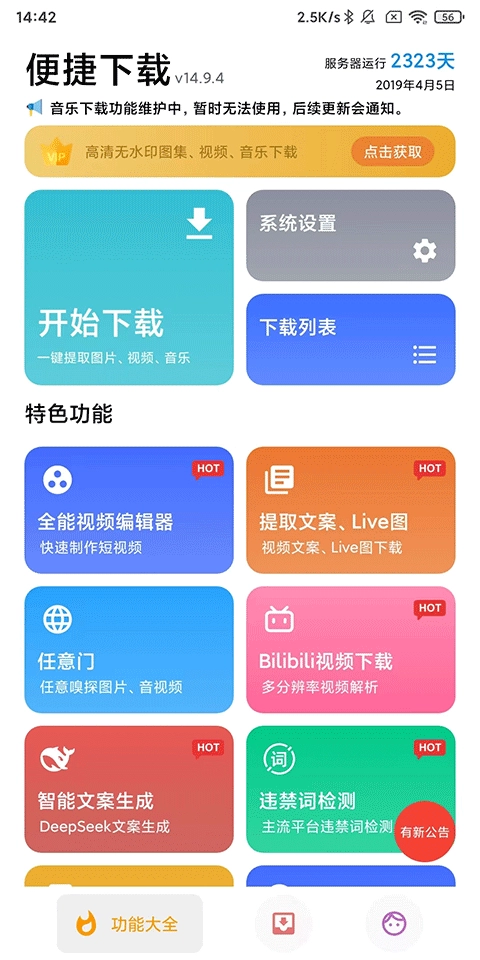 1. 功能汇总:具备全能视频编辑功能,可进行文案提取与live图处理,还有任意门、bilibili视频相关功能,以及deepseek智能文案生成和违禁词检测功能。