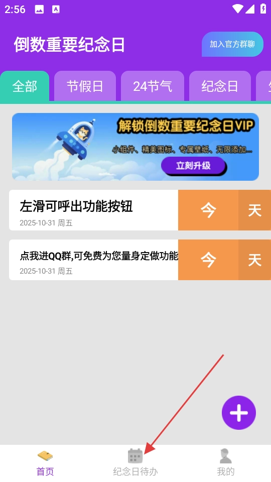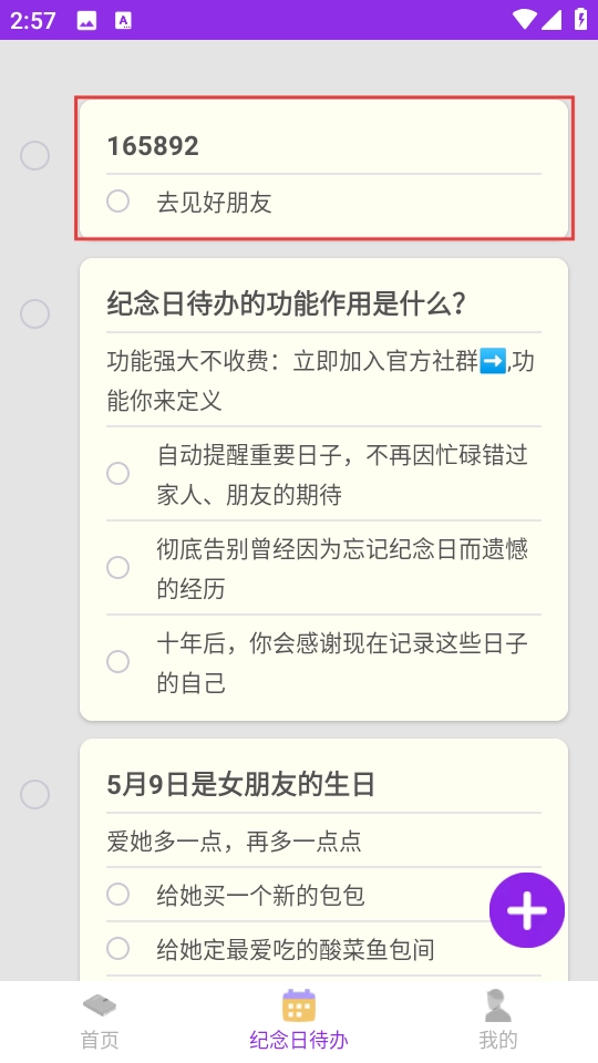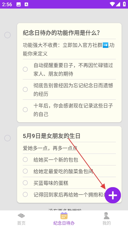 2. 在【纪念日待办】页面,轻点右下角的紫色“+”号,即可进入编辑纪念日待办的页面。