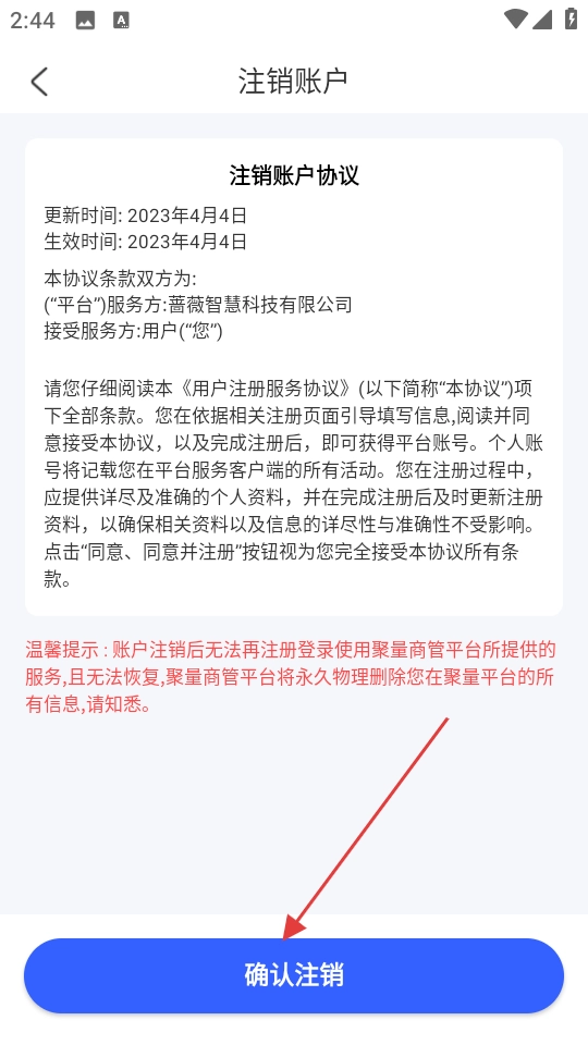 4、在【注销账户】页面,阅读协议后点击【确认注销】,完成账户注销操作。