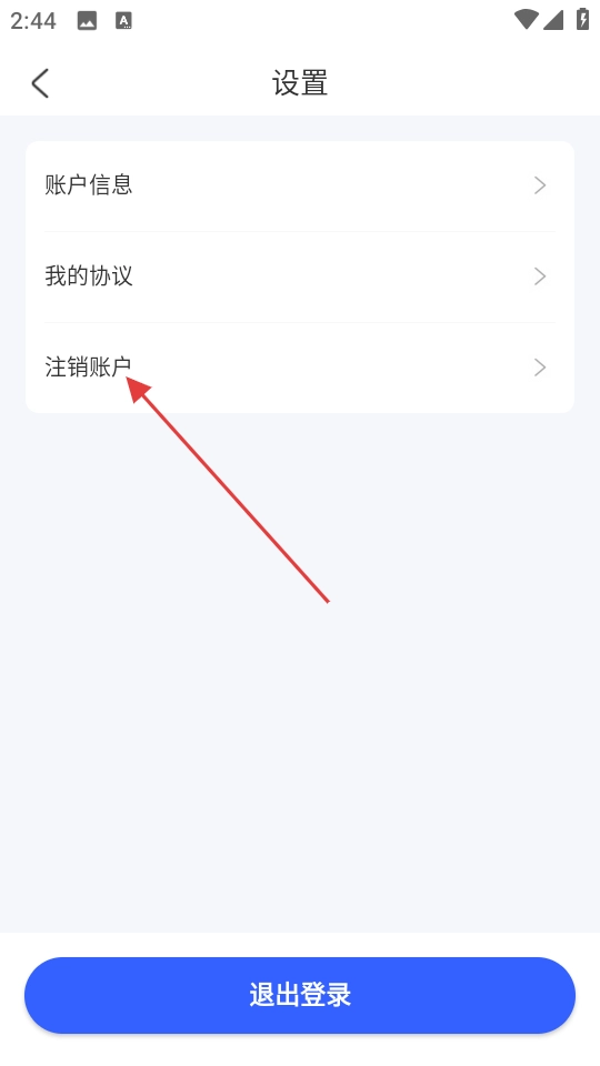 3、在【设置】页面,点击【注销账户】,进入注销账户协议页面。