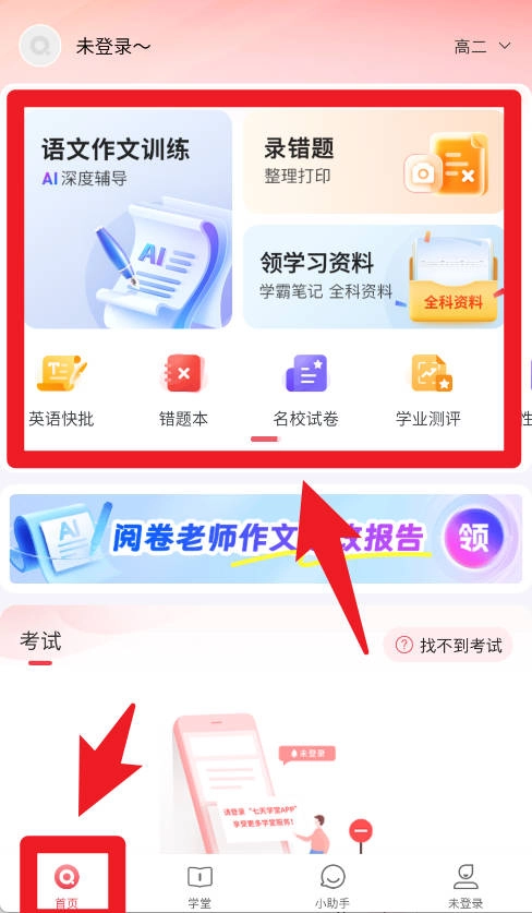 2、在首页中,提供语文的作文训练、错题本、学习测评等模块,家长和学生都能根据需要快速找到合适功能。