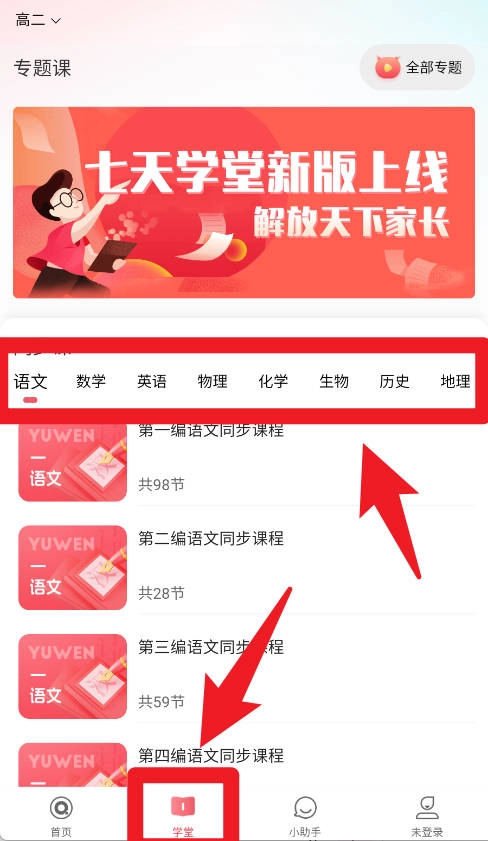 4、在学堂板块中,可根据科目分类查找语文、数学、英语、物理、化学等同步课程,配合名师讲解进行系统学习。