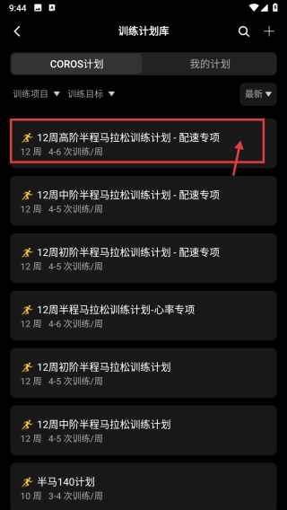 3、在训练计划库页面,点击12周高阶半程马拉松训练计划 - 配速专项条目,进入计划详情页。