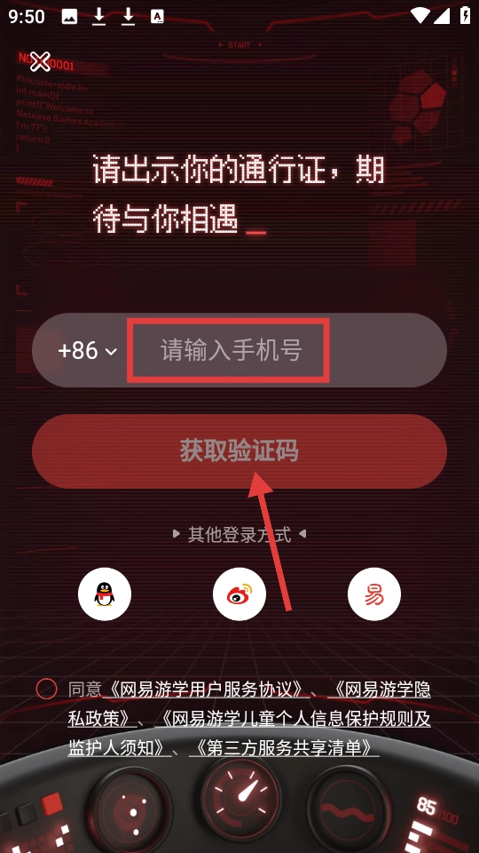 3、在【请输入手机号】处填写手机号,勾选协议后点击【获取验证码】进行登录操作。
