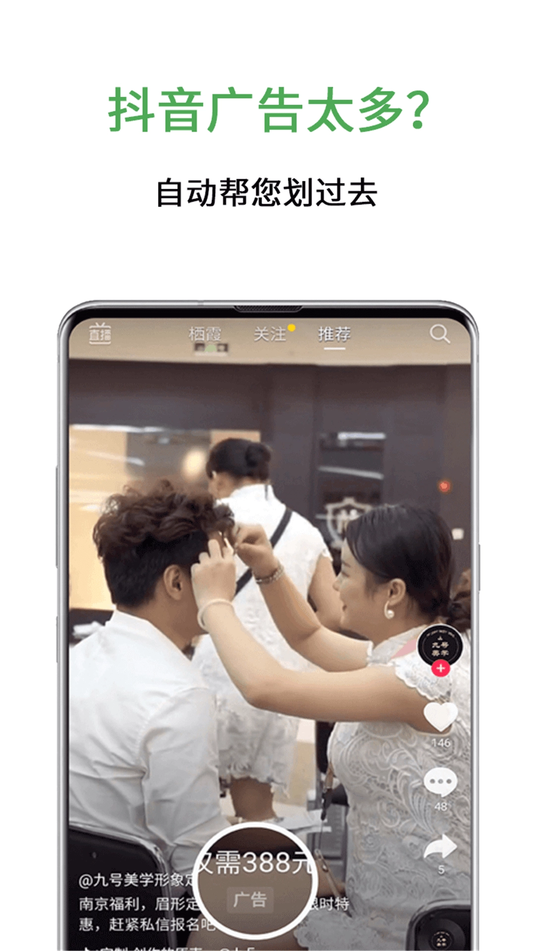 「短视频广告划过」刷几条短视频就有广告出现?就有直播出现?用「去广告」吧,短视频广告自动滑过,滑过直播,还你干净上网环境。