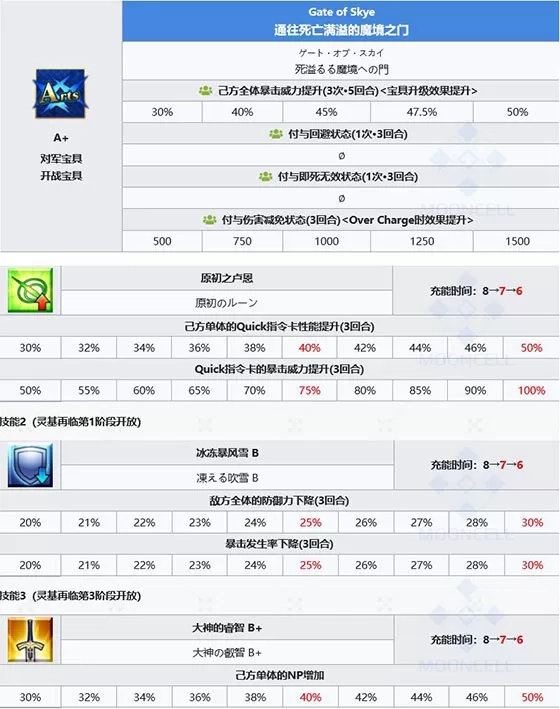 技能组持续三回合的30%降防、50%绿魔放和100%绿卡暴击,3技能为单体50%的充能。双CBA体系,爆发上限和持续爆发能力极高,绿卡英灵可以在3回合内打出巨额伤害。