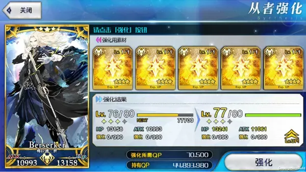 4、同时由于星级越高的从者强化时所消耗的QP越高,所以一些较低星级的狗粮不适合用于高星级从者的强化,否则前期有限的QP会显得十分吃紧,因此建议在50级以上的五星英灵不使用四星以下的狗粮进行强化。