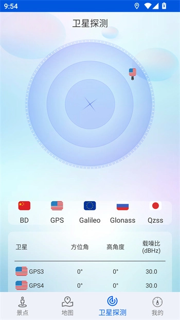 4、在 “卫星探测” 页面,能实时查看不同卫星的方位角、高度角及载噪比等专业数据。
