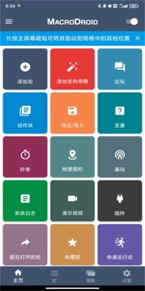 MacroDroid中文版是一款实现程序自动化的应用,具备自动编辑机器人宏的能力,能助力用户轻松开启各类应用。用户通过设置不同的触发条件,可让手机变得更加智能。该应用支持众多应用程序,添加宏不仅便捷,而且大多实现了自动化。每日对兼容性的拓展,能让用户有更多关于宏的精彩发现。其界面设计直观简约,提供多样的个性化选项,还包含可供用户共享的模板,用户既可以直接使用,也能够根据自身需求定制。此外,它还支持root权限增强功能。