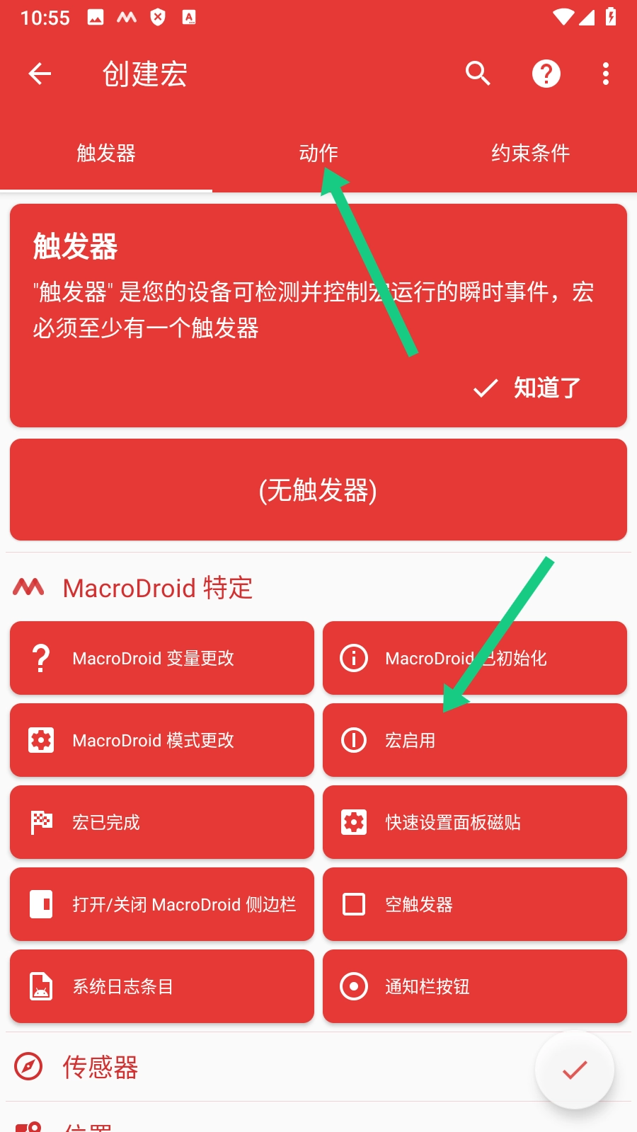 2. 在创建宏的页面,挑选【需要的触发器】进行添加,建议完成添加操作后,点击【动作】进入动作页面。