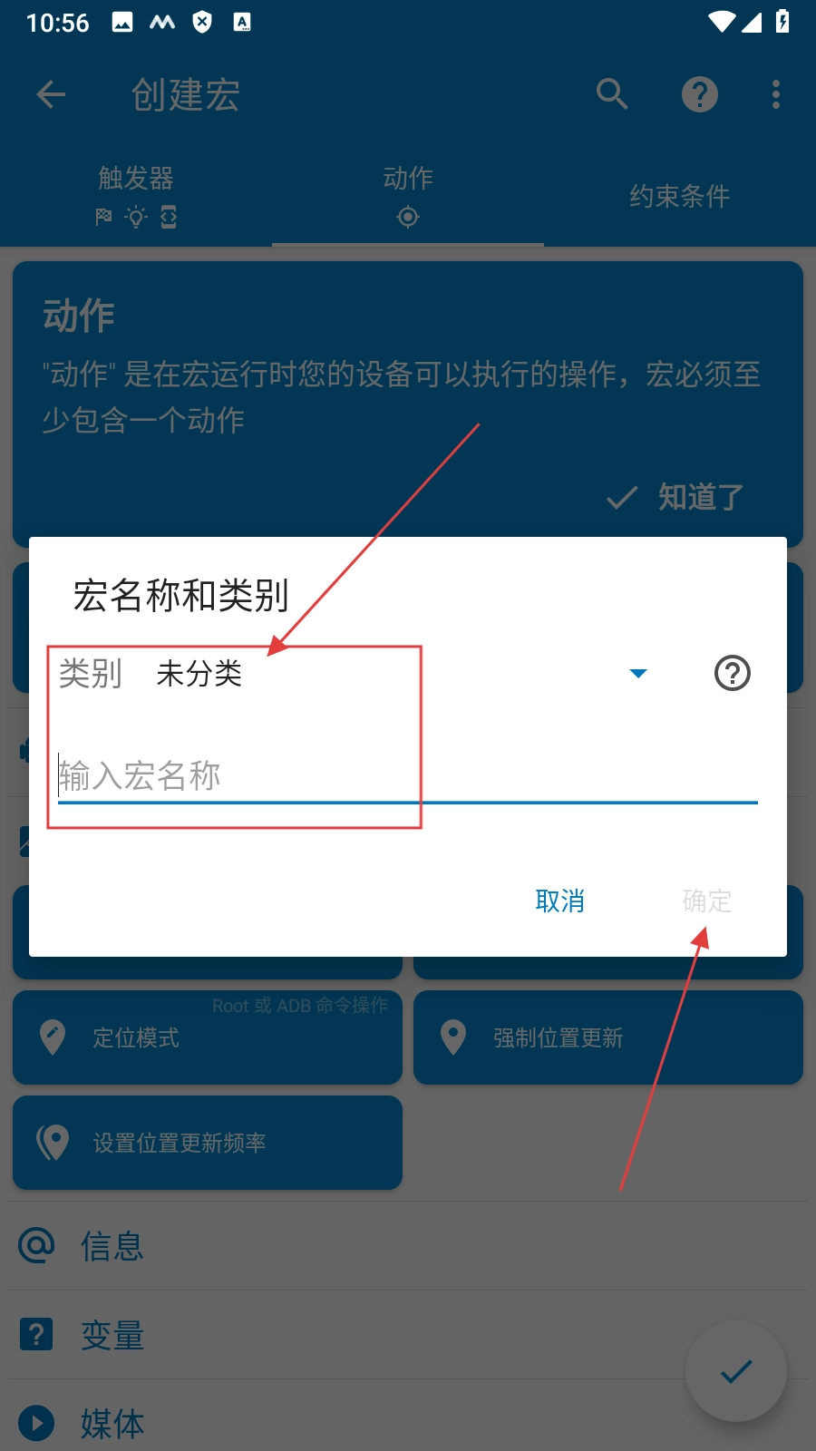 3、于动作设置页面,挑选【所需动作】,随后点击【确认】,即可进入宏命名页面。