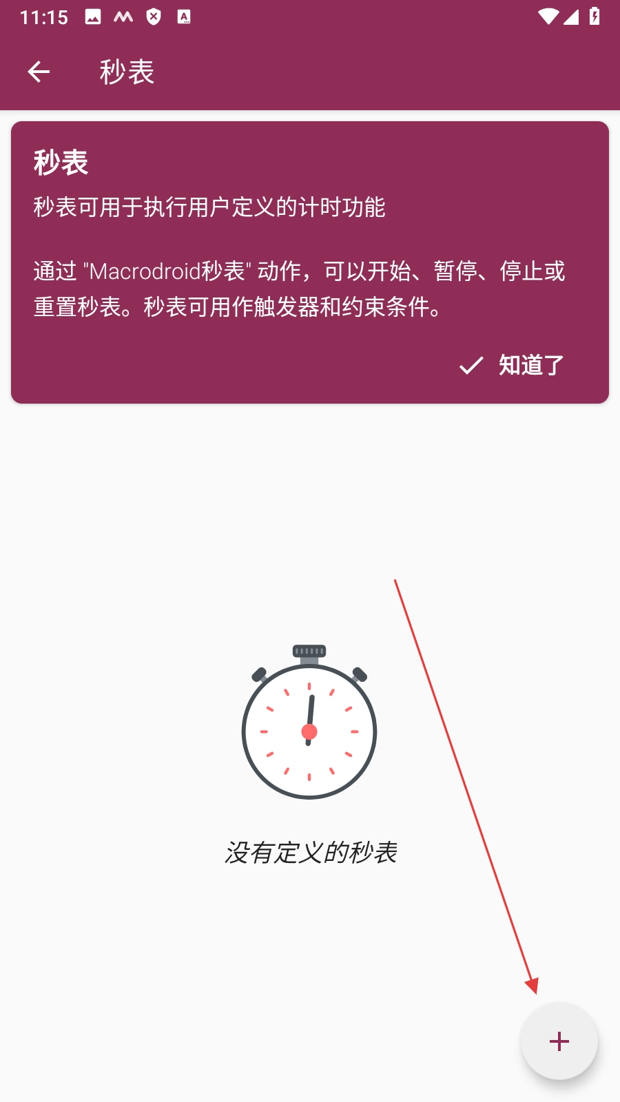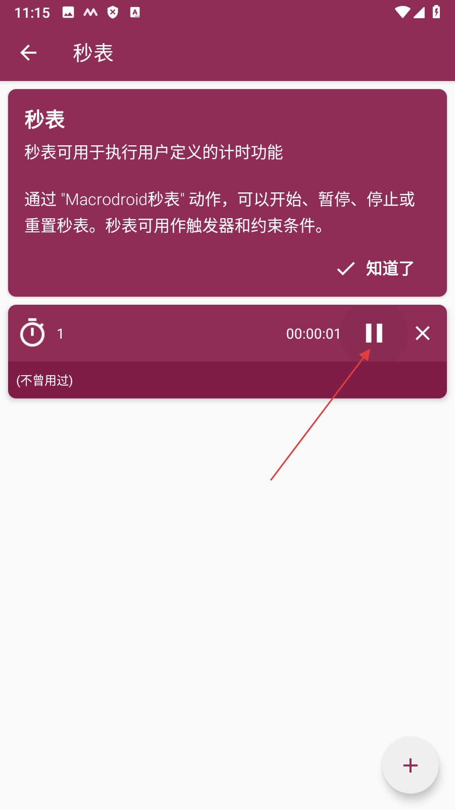 4、新秒表创建后,点击【暂停按钮】即可开始使用秒表。