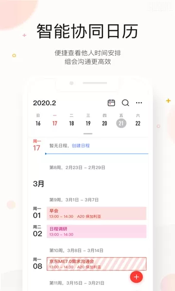 1、【日程】开放式日程管理平台,为员工提供所有日常会议、项目的日程安排,助力员工便捷地开展时间管理与协同办公。
