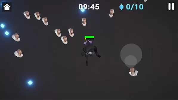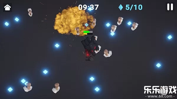 资源管理:通过拾取蓝色水晶升级角色属性(如移动速度、血量、武器威力),提升生存能力。