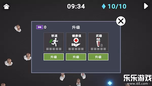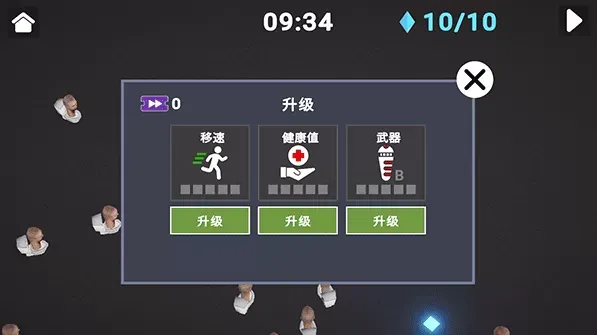 技能升级系统:收集蓝色方块解锁新技能,或对移动速度、健康值、武器进行升级,增强战斗效率。