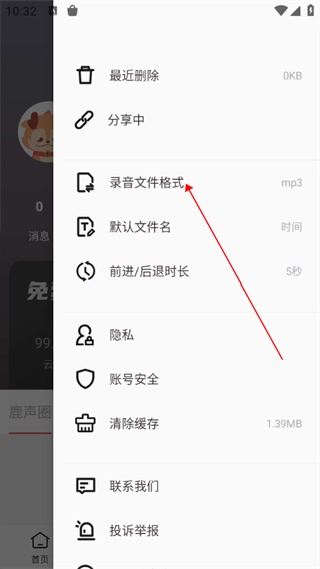 3. 打开随声鹿设置,点击【录音文件格式】选项。