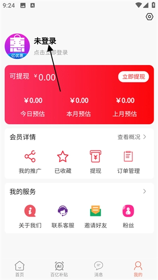 1、打开亿优惠,点击页面右下角我的,可进入个人中心页面。